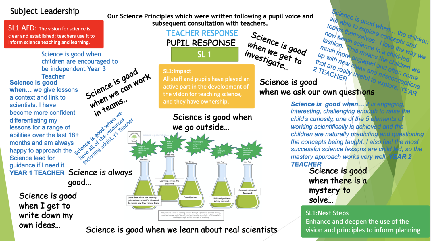 Children not only acquire the appropriate age-related knowledge linked to the science curriculum, but also skills which equip them to progress from their starting points, and within their everyday lives. By the end of Key Stage 2, children have: A wider variety of skills linked to both scientific knowledge and understanding, and scientific enquiry/investigative skills. A richer vocabulary which will enable to articulate their understanding of taught concepts. High aspirations, which will see them through to further study, work and a successful adult life.